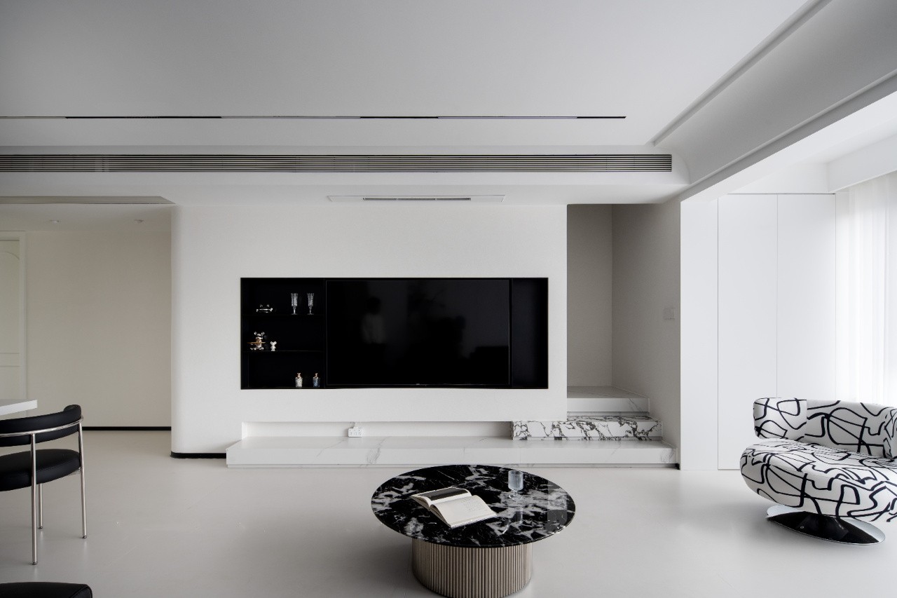 电视背景墙不仅保持了极简本色,更在其基础上拥有了力学美感与艺术细节。无论是不对称台阶设计,还是花灰色大理石的局部点缀,都赋予背景墙别具一格的优雅视觉。