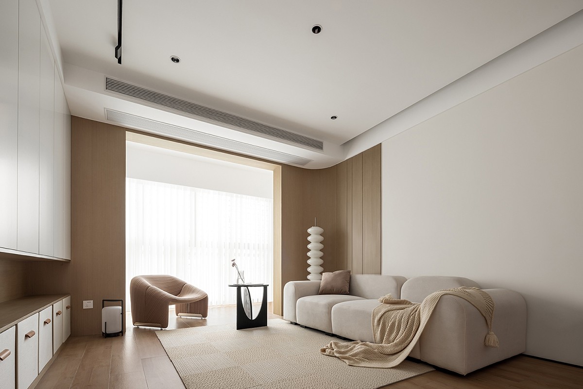 自然质感的松弛场域:木色与白色的材质对话,在沙发、单人椅的柔化轮廓中更显温润。整墙柜体藏起琐碎,只留光线透过纱帘漫入,搭配螺旋灯与编织毯,把“放空”的松弛感刻进日常。